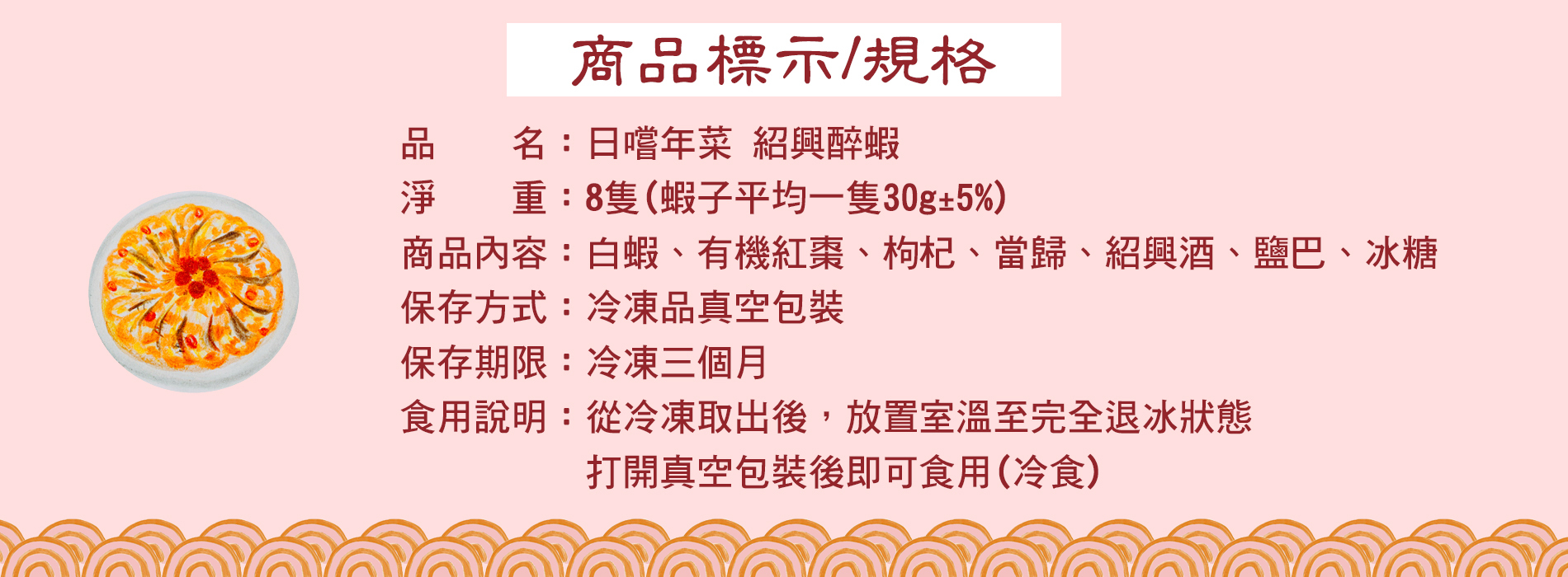 紹興醉蝦,顧名思義就是有陳年紹興濃郁酒香味+冬季進補當歸、有機紅棗及枸杞,蝦子精選規格每公斤30/40隻的白蝦